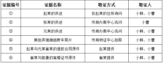 A、AB、BC、CD、D 45 张某作为担保人,介绍赵某向元某和崔某借款50万元。由于赵某一直未还钱,某晚张某寻找机会,将赵某的车钥匙偷走,后开走赵某价值78万元的黑色奔驰越野车,随后交给元某保管。赵某发现后联系张某,张某表示必须在赵某清偿债务后才予以归还。赵某遂报警。在案件调查过程中,民警小韩和小曹收集了若干证据,并制作了部分证据一览表(见下图)。表格中符合合法性、真实性和关联性特征的证据是: